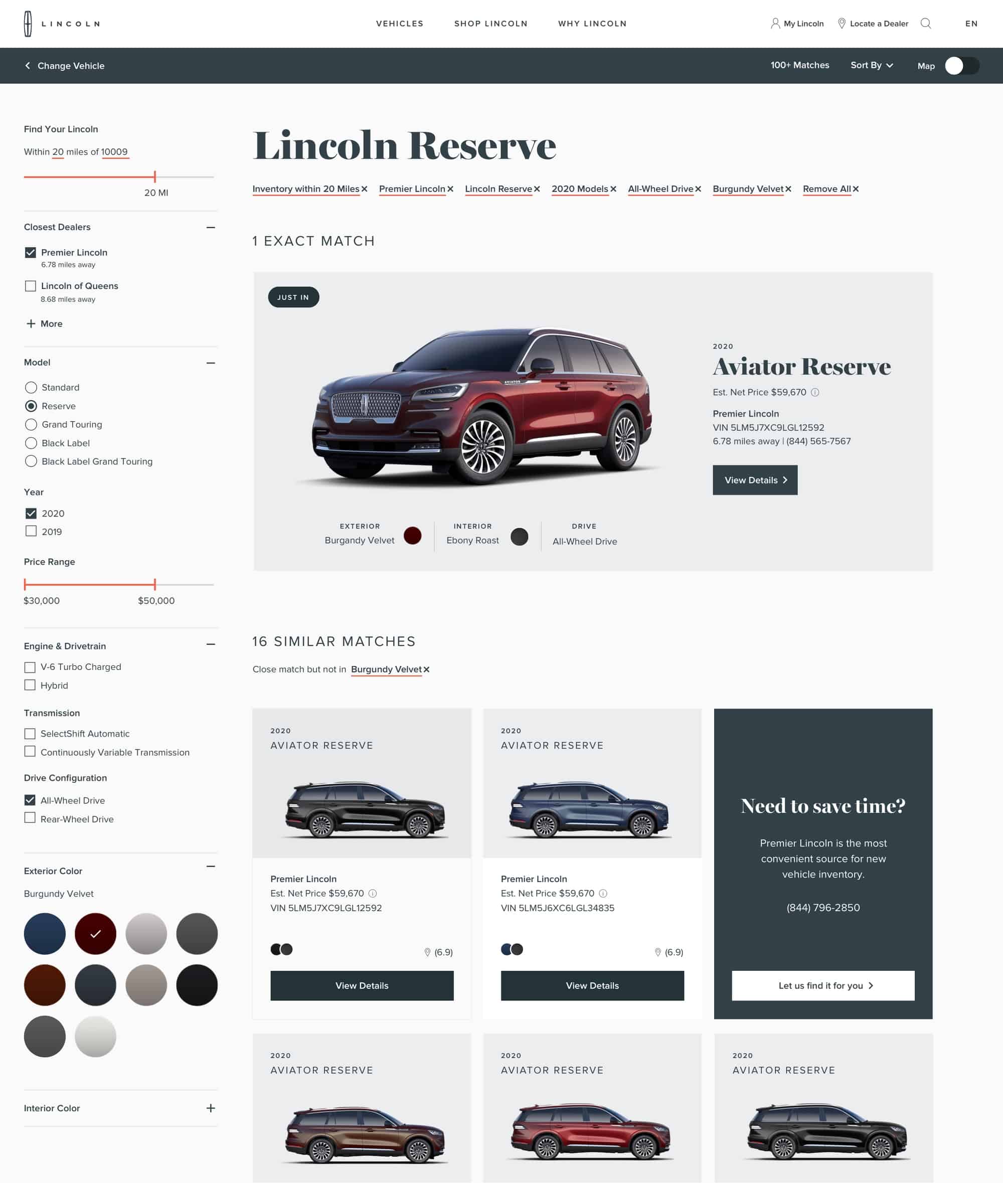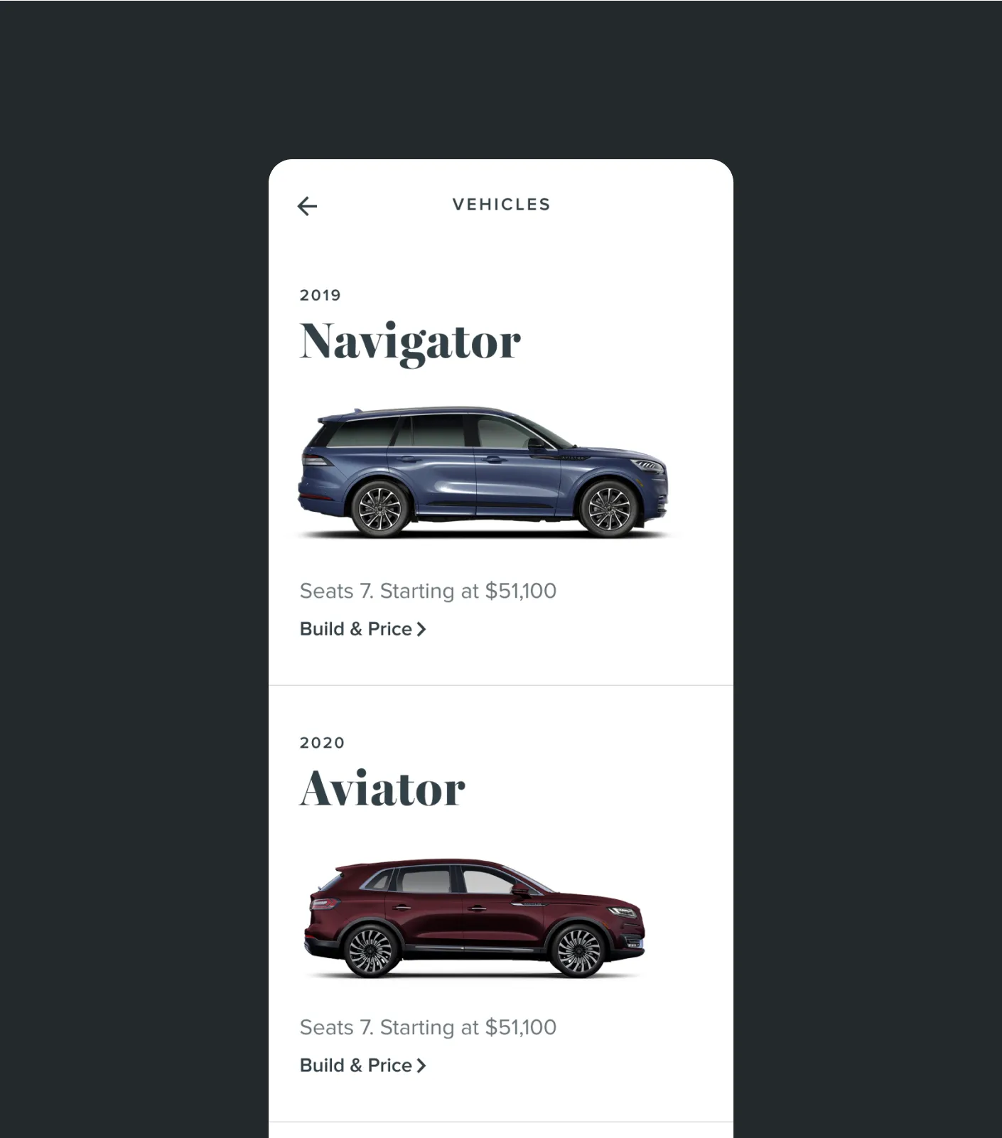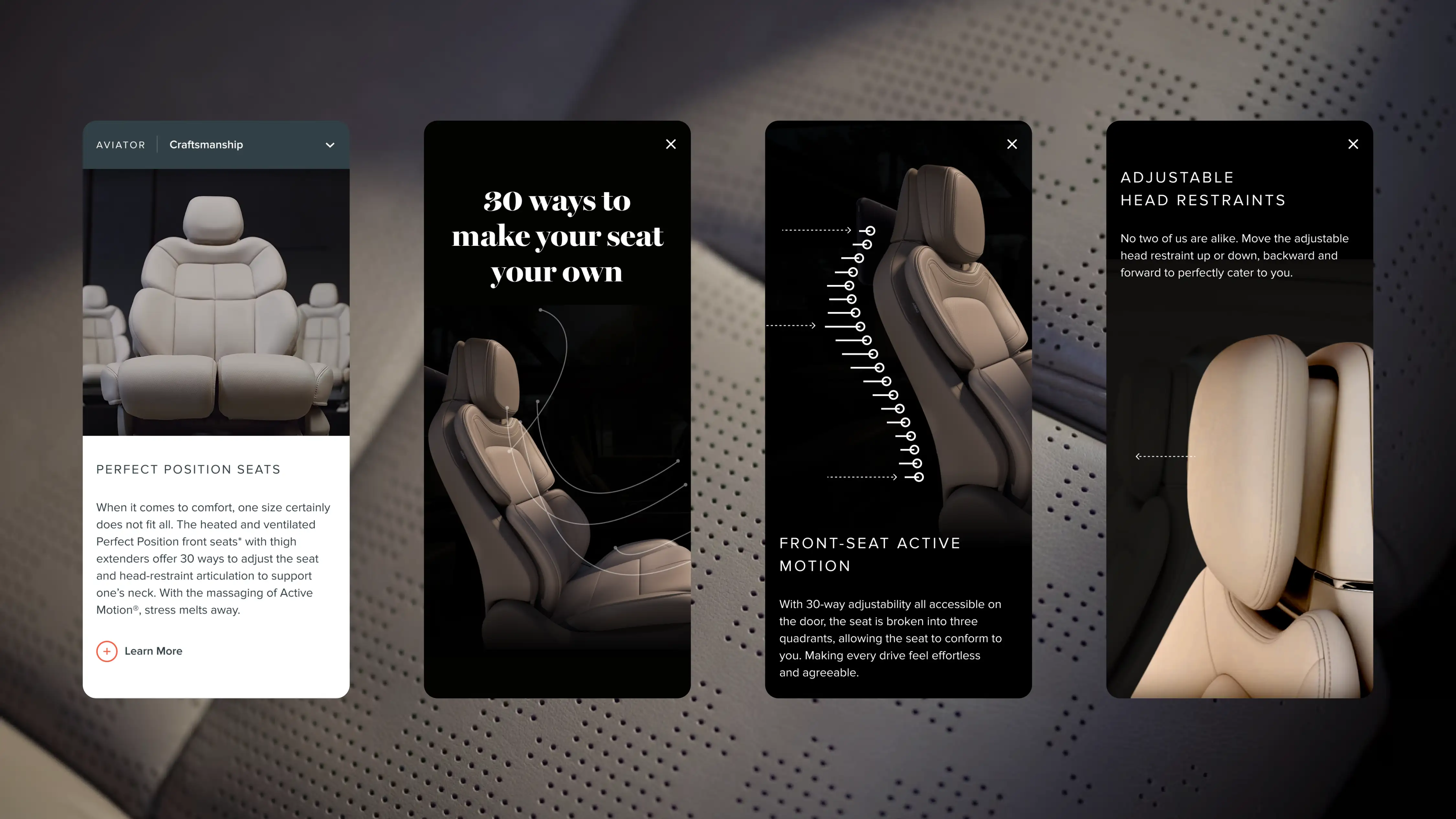 We designed a unified digital architecture that organizes complex vehicle information into clear, scannable sections. A refined grid and visual hierarchy guide users naturally through each step. Subtle motion introduces content at a calm, deliberate pace that reflects Lincoln’s sense of quiet luxury. The “Build Your Own” tool connects seamlessly with pre-configured models, leading users from exploration to real-time local inventory without breaking flow.